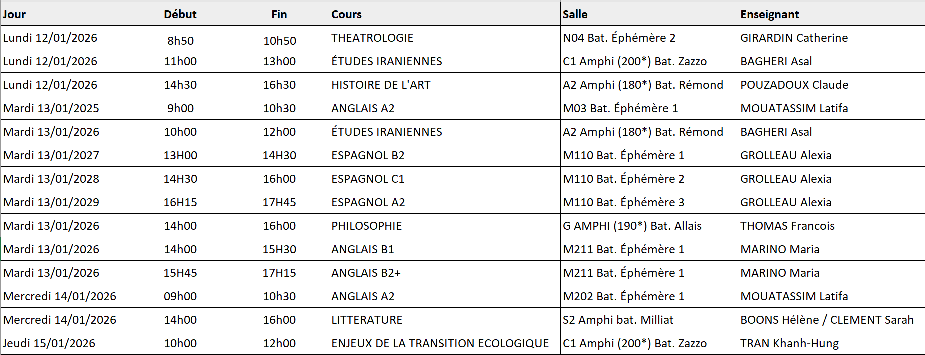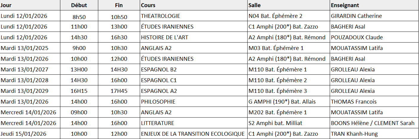 Le cours d’espagnol d’Alexia Grolleau prévu le mardi 6 janvier est reporté à la semaine prochaine, le mardi 12 janvier, aux mêmes horaires habituels.