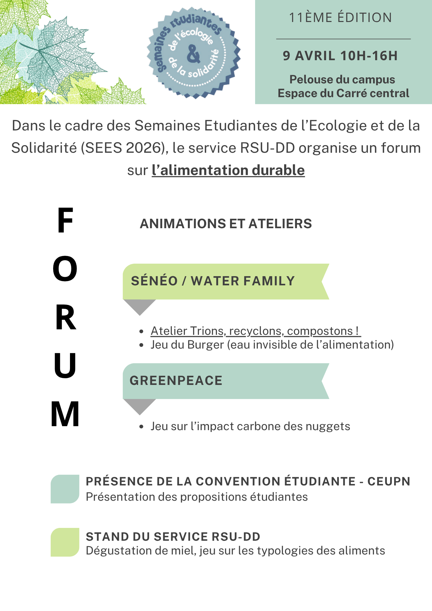 Dans le cadre des Semaines Étudiantes de l'Écologie et de la Solidarité (SEES 2026), le service RSU-DD organise un forum consacré à l’alimentation durable le 9 avril 2026, de 10h à 15h, afin de sensibiliser la communauté étudiante à l’importance d’adopter une alimentation saine, locale et de saison.